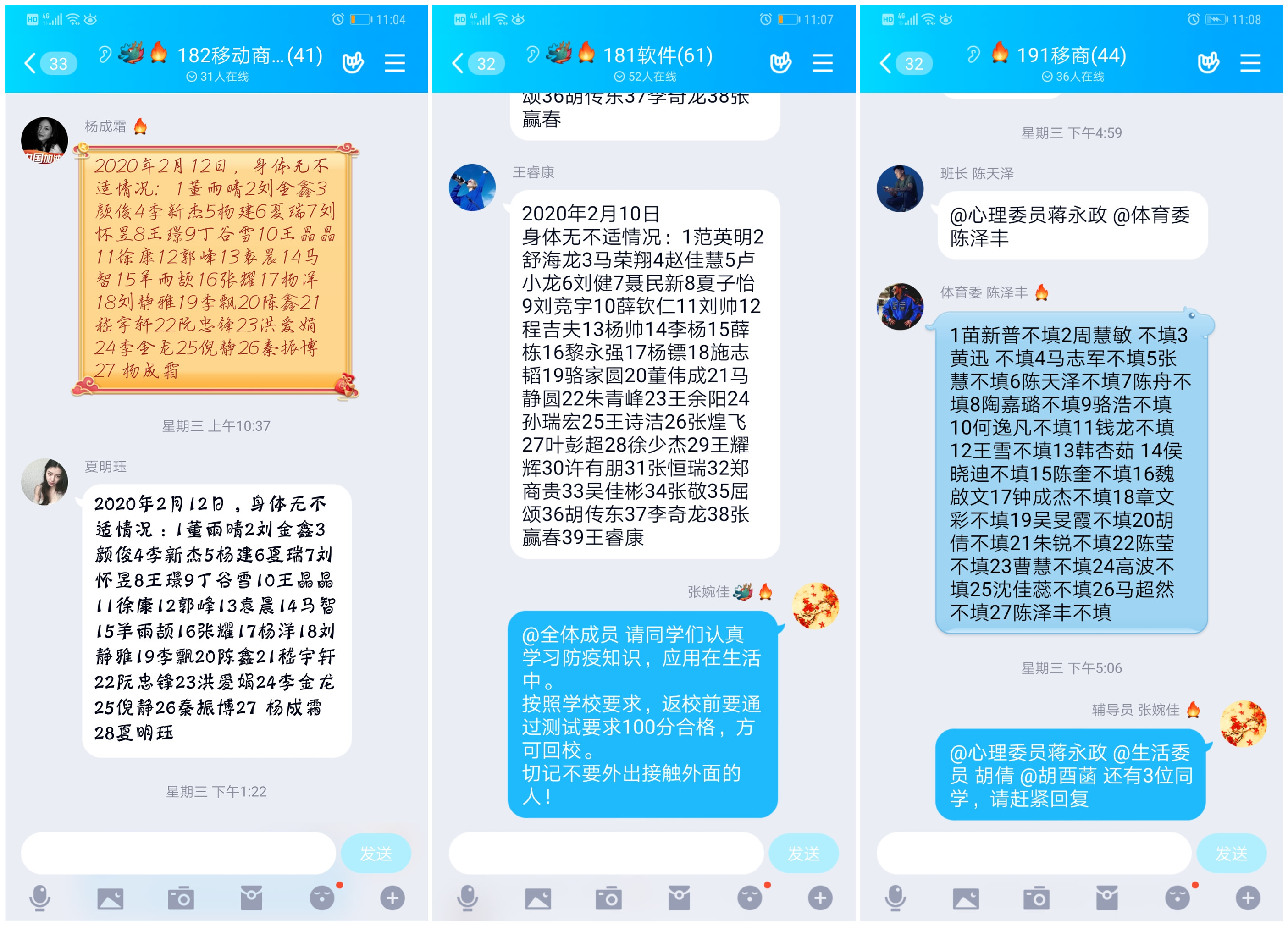 二是“勤勉”守好岗位。立即从“休假”状态进入“战时”状态,每日24小时在岗在线,“键对键”与学生“心连心”,密切掌握学生健康、思想动态,从开始的班级群里接龙日报制度到目前的“今日校园”信息收集任务推送,坚持覆盖到每一名学生。及时向同学们宣传党的政策和各级各部门卫生防疫知识,教育引导同学们服从属地管理。及时申报个人健康状况,时刻发挥好高校疫情防控一线战斗员职责。