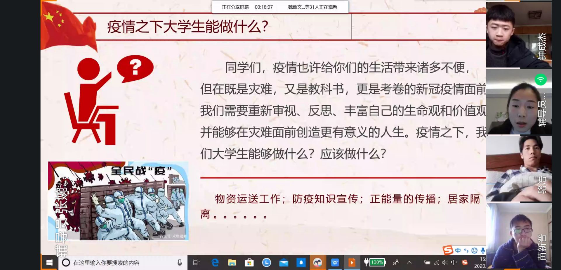通过此次主题班会,同学们都深有感悟。软件181程吉夫说:“在家积极主动配合防疫,学习专业课程,总得来说压力挺大的,对自己的自控力也是一个很大的挑战,要把握好这个特殊特长的寒假,好好学习,增强为社会服务的本领。”移商182陈鑫说:“作为大学生,我们要做好自己该做的,不给别人添麻烦,保护好自己就是对医护人员最大的帮助,在做好个人的基础上还要尽自己所能传播抗疫知识,帮助家人和身边人。同时,在疫情期间,也要努力学习,只有成为一个知识渊博的人,未来才能为社会做出更大的贡献。”移商191的骆浩说:“在家努力让自己过得充实,通过课程学到的PS操作技能,在家不断练习PS技巧,制作疫情相关的海报,学习写网文并向一些网站投稿,不断充实自己,提高能力。”