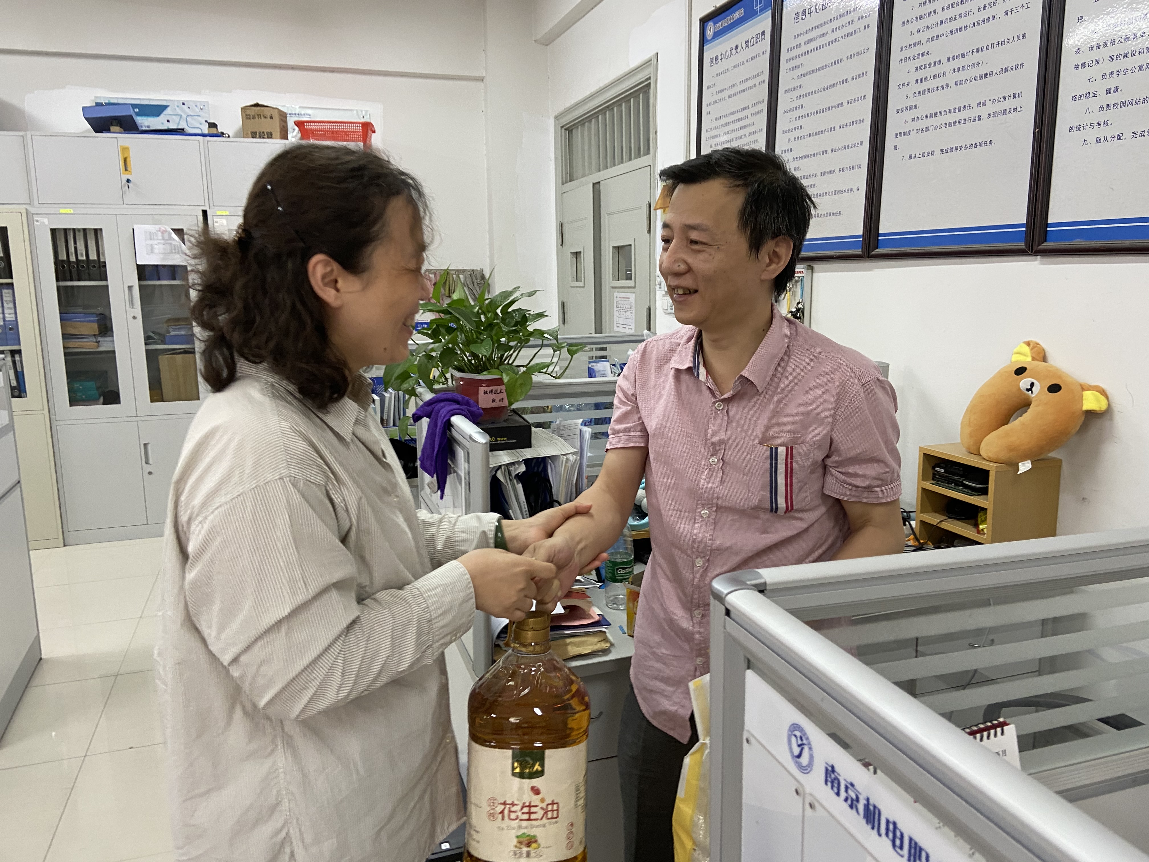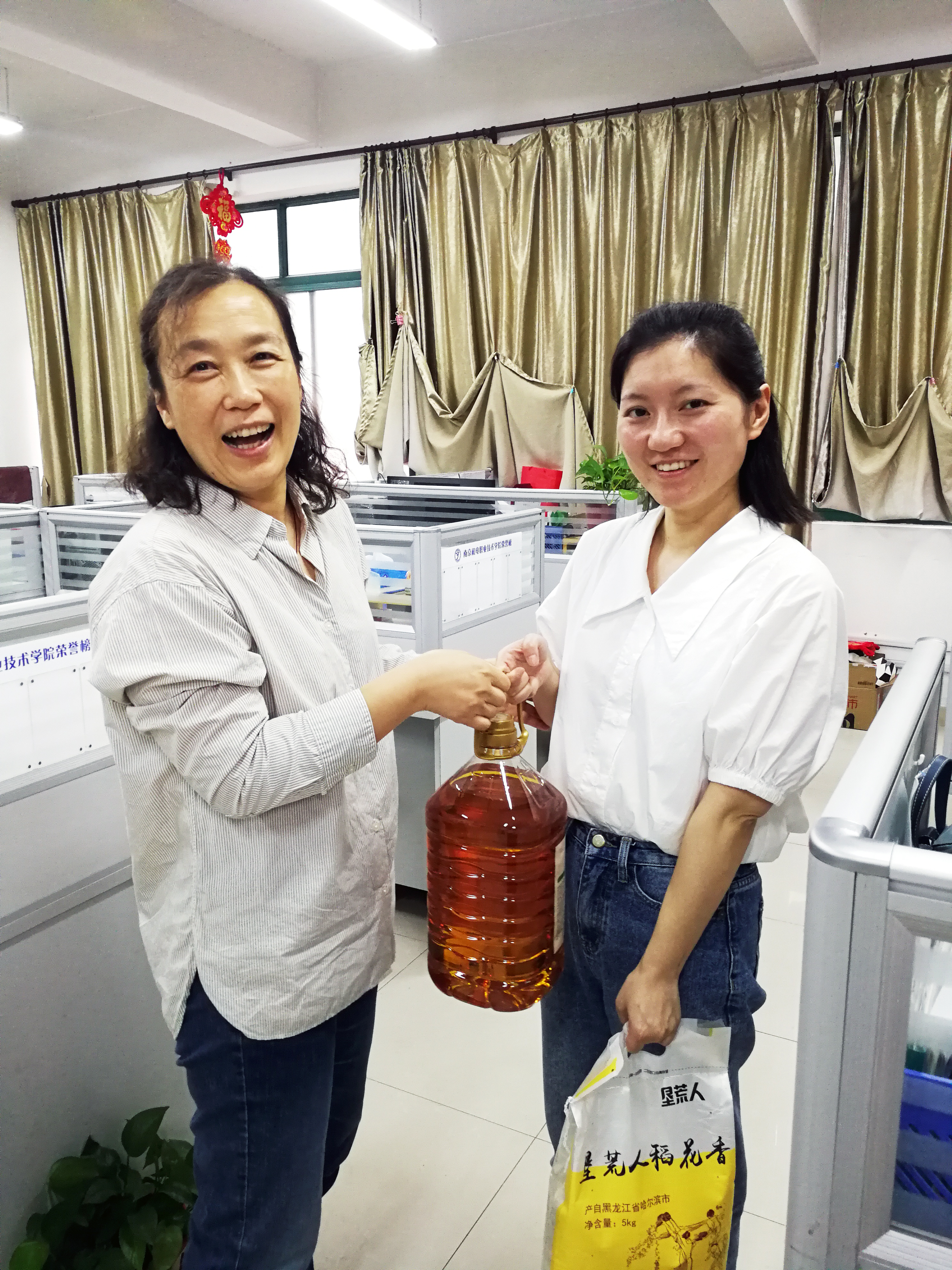 慰问中,王主任和胡书记代表系部、学院给每一位教职工送去了大米和花生油等物品,对大家这段时间的舍小家、为大家,忠于职守,为全系学生的健康安全默默付出表示感谢。