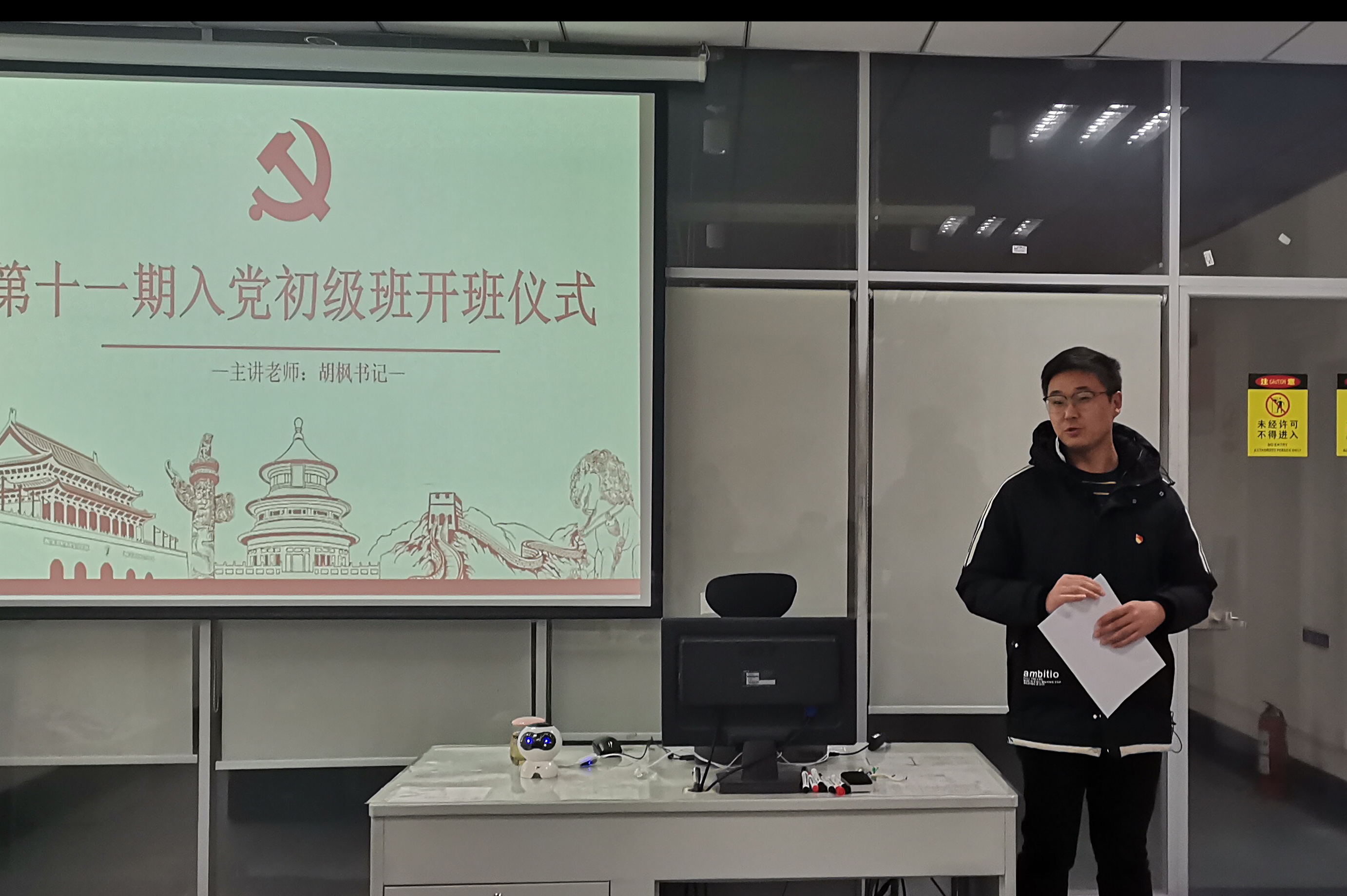 会议由团总支书记于宇老师主持,伴随着国歌的奏响,第十一期初级党课班开班典礼正式拉开帷幕。首先由胡枫老师讲话,她对同学们提出了三个要求:"实学、实求、实干”。并且为大家制定了党课初级班的签到和上课要求。