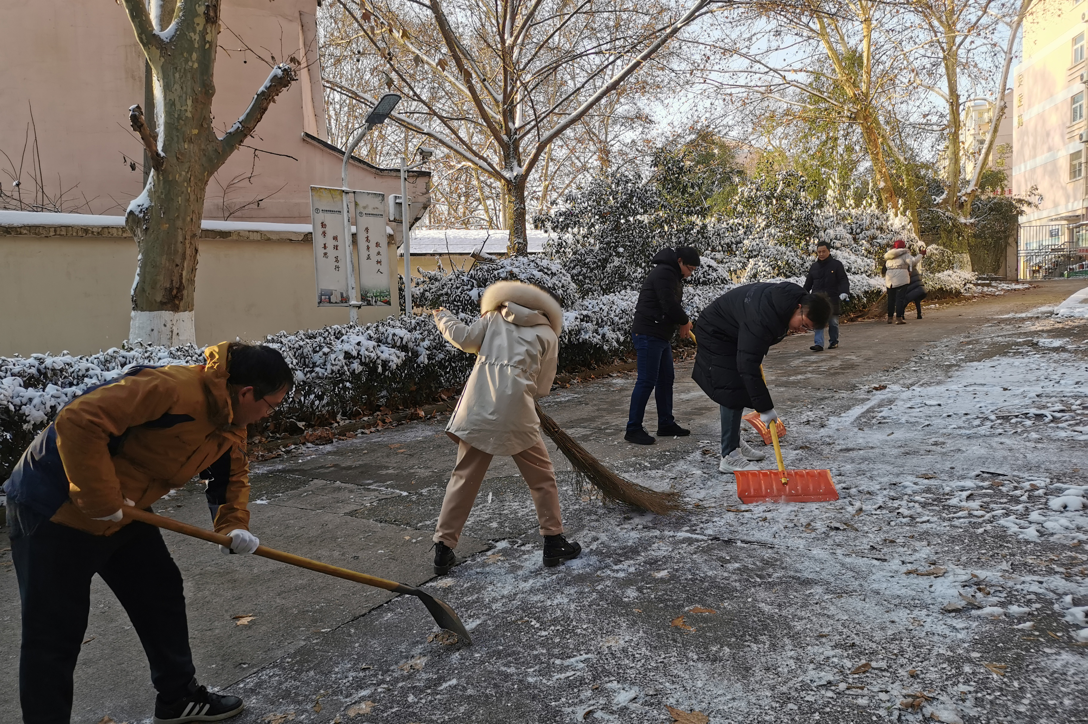 在热闹的劳动声中,铁铲、笤帚、扫帚、木板等工具各显神通,在老师们的手中变成了扫雪法宝。大家的的手和脸都冻得通红,但这丝毫没有影响到劳动的热情,大家干劲十足,团结协作,经过一小时的奋战,信息工程系负责的道路被打扫得干干净净,扫雪破冰任务圆满完成。