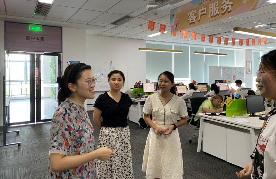 在孩子王儿童用品股份有限公司,胡枫书记同顾客满意中心的李经理进行了深入交流,与实习学生进行零距离对话,了解学生在企业实习情况、生活情况、环境适应情况等,李经理对信息工程系学生的实习表现给予充分肯定,认为我们学生理论基础扎实、遵守纪律、勤奋努力、进步较快,在企业所有合作院校中综合表现排名前列。