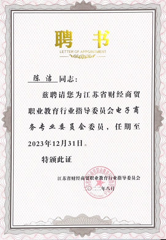 会议中,江苏省人社厅职业能力建设处二级调研员陈彦德强调了职业教育的重要性,指出电商专委员应建立健全政府主导、行业指导、企业参与的职业教育办学机制,强化行业在现代职业教育体系建设和职业教育改革发展中的指导作用。接着,江苏省财经商贸职教行指委副秘书长刘登辉介绍了行指委及6个专委会建设基本情况,希望电商专委会不断探索新形势下行指委工作的新思路、新路径、新模式、新方法,为我省财经商贸类职业教育的高质量发展做出新的贡献。此后,会议审议公布《电子商务专业委员会增补常务委员、委员人员名单》并颁发证书,并由多位专家分享主题报告。最后,专委会各工作组还就下半年工作计划进行了交流和讨论。我校施炜老师被聘任为江苏省财经商贸职业教育行业指导委员会电子商务专业委员会常务委员,郑旻璐老师、陈洁老师被聘任为江苏省财经商贸职业教育行业指导委员会电子商务专业委员会委员。