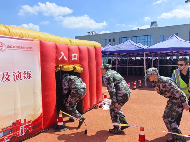 “弯腰、捂口鼻、沿疏散指示标志快速通过!”在模拟烟热逃生帐篷入口处,教官的指令清晰有力。帐篷内浓烟弥漫(由安全烟雾剂模拟),光线昏暗,通道曲折,真实还原了火灾现场的紧急状况。新生们依次进入帐篷体验逃生。现场工作人员通过现场引导,确保每一名学生都能正确掌握“低姿逃生、判断方向、有序撤离”的核心技能。