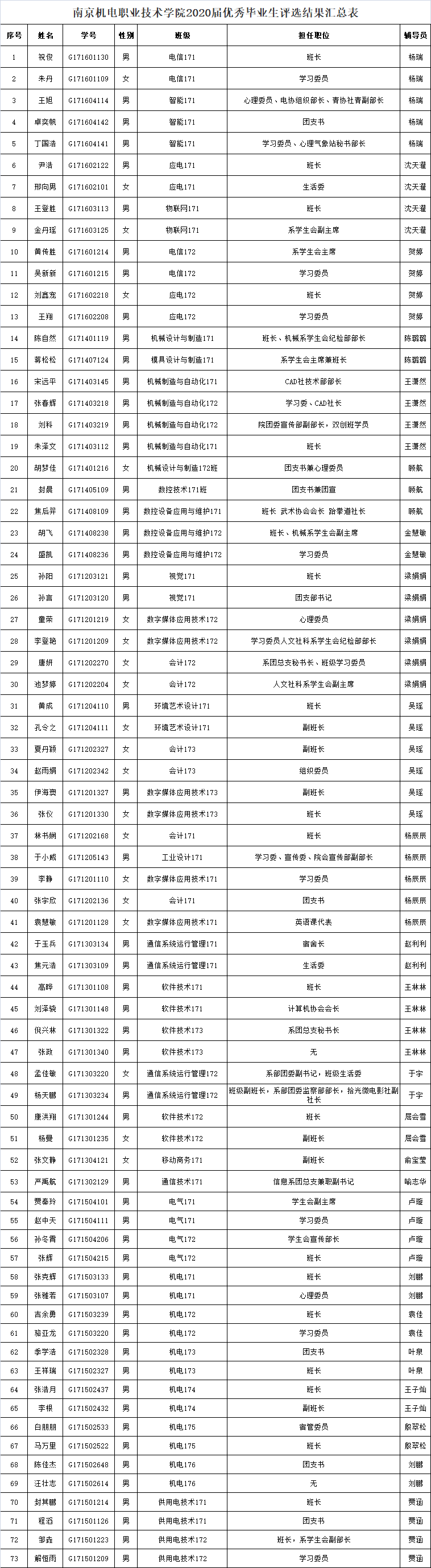 根据南机电院 学[2]号《关于评选2020届优秀毕业生的通知》,经班级评选,系部审核,学工处复核,决定拟推荐以下73名同学为2020届幻影网页版登录入口_幻影(中国)优秀毕业生。现予以公示,公示时间:2020年6月24日—2020年6月30日。联系人:宁燕,电话:025-84190262,18061230078。