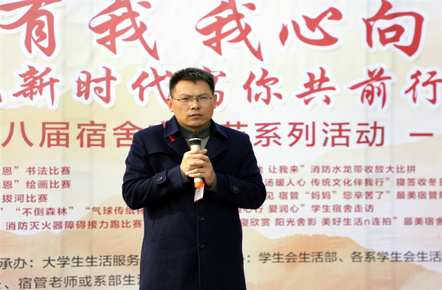 学生工作处处长张宝中首先代表全体师生对默默奉献的宿管老师表示衷心的感谢。张处在致辞说道:文化节弘扬了中华民族的传统文化,身为南京机电的一名新时代青年应大力传承传统文化,提高个人文化修养、塑造自身形象,宿舍文化节是校园文化中不可分割的一部分,倡导同学们积极参加系列活动,加强同学之间的友谊,营造校园温馨氛围。
