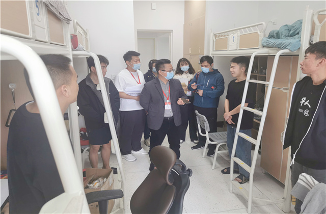 为筑牢疫情防控安全屏障,深入了解学生的学习生活情况和思想动态,有效保障学生的学习与生活秩序,2022年4月18日,在学校党委统筹安排下,住校校领导带领学工战线的老师们再次走进学生宿舍。