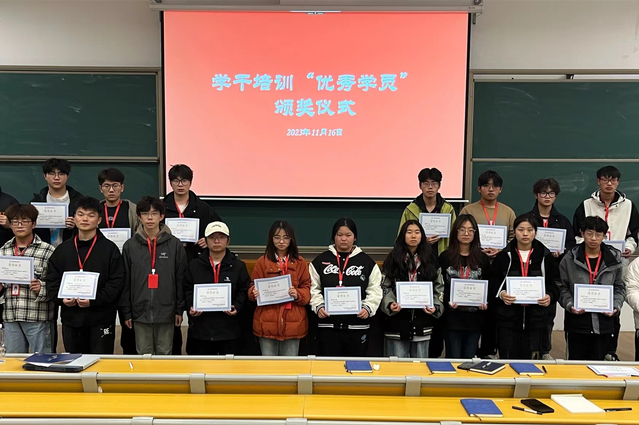 发言结束后,由乔浩纭和耿天赐为各位获奖同学颁发本次学干培训的证书。荣获“优秀学员”奖项的同学们在热烈的掌声中有序上台领取证书。希望受到表彰的同学们能够再接再厉,争做表率,鞭策后进,建设良好校风。