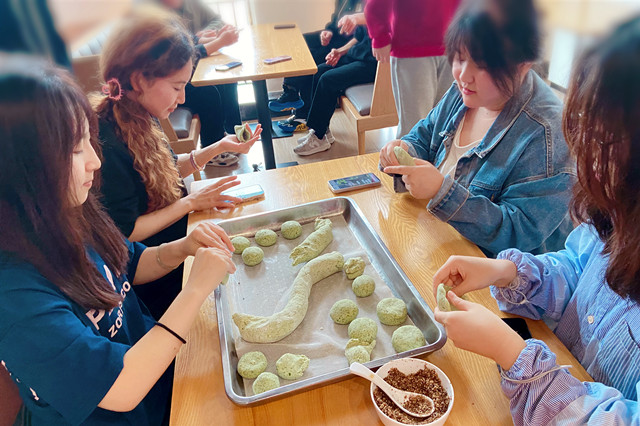 笑容满满食青团。食过青团,方知春天。新鲜出炉的艾叶青团,色如碧玉,香气沁人心脾,叫人食指大动,大家一同品尝亲手制作的青团,品一口春天的味道,脸上都洋溢着欢乐的笑容,欢声笑语充盈每个角落。