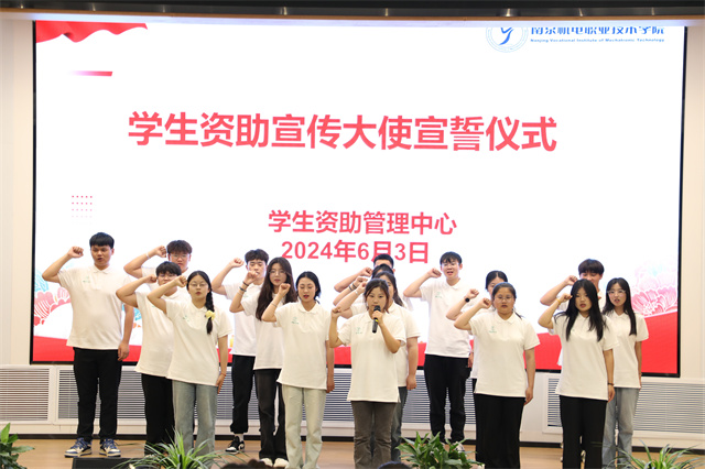 随后,进行新一届学生资助宣传大使集体宣誓仪式,铿锵有力的誓词,表达了他们励志成才、不辱使命、播撒爱心的决心。