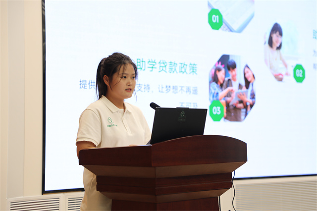 学生资助管理中心主任钱莉娇首先介绍了开展本次活动的目的,她希望每一个家庭经济困难学生懂政策、用政策,切身感受到党和国家对同学们的爱护。同时要求学生资助管理中心和学生资助宣传大使要把资助政策讲明白、讲清楚,让借贷学生除了知晓国家助学贷款政策,还要知晓奖助学金、勤工助学、困难补助等内容,切实免除后顾之忧。她呼吁受到国家资助的同学们知恩于心,感恩于行,用心观察,用心感悟,用心传播爱的种子,在党和国家以及学校的资助与关怀下,自强不息、扬帆逐梦!