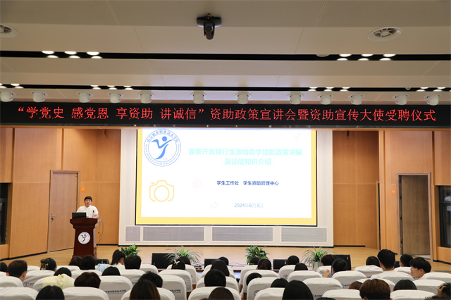 为全面贯彻落实党的二十大精神,落实学校关工委工作要求,广泛宣传落实国家资助政策,进一步推进发展型资助育人工作,加强学生资助宣传大使团队建设和培养,做好学生的诚信教育和励志教育,2024年6月3日晚,学生工作处学生资助管理中心在乐学楼报告厅开展资助政策宣讲会暨学生资助大使受聘仪式。全体学生资助宣传大使、生源地信用助学贷款借贷学生参加活动。活动由学生资助中心朱丹丹老师主持。