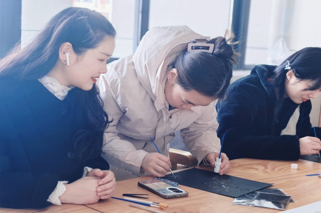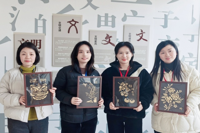 烧箔画活动女老师们纷纷亲自动手,深入体验烧箔画的独特魅力。金箔在纸张上闪烁着璀璨的光芒,仿佛在诉说着古老而神秘的故事,将参与者带入一个宁静而深远的境界,让时光在这一刻仿佛变得缓慢而悠长。每一笔每一划,勾勒出轮廓;每一粘每一扫,铺陈色彩。通过一系列的绘图、上胶、贴箔、扫箔、封层、装裱等工序,一件件光彩夺目的作品得以诞生。