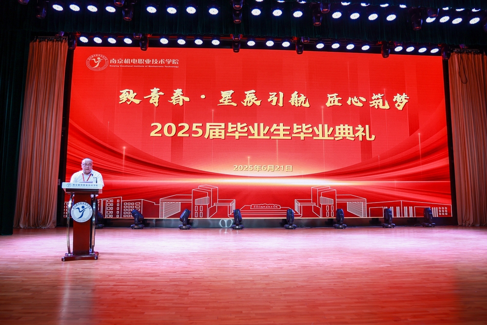 周庆礼为2025届毕业生送上寄语,他感慨同学们在校三年,亲眼见证党和国家事业昂首阔步,迈向崭新发展高度;携手助力南机电事业破浪前行,书写高质量发展新篇章;奋力铭刻南机电岁月成长印记,铸就了成才路上荣光。周书记深情嘱托全体毕业生:要以技立身,做深耕细作的“手艺人”;以融破界,做跨界融合的“破局者”;追“新”逐“质”,做守正创新的“担当者”;以韧致远,做笑对风雨的“追光者”。他祝福毕业生们在未来的追梦路上以技为锚,以融为帆,以新为舵,以韧为桨,乘风破浪、步步生花!