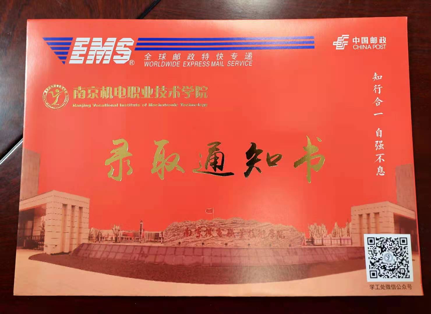 2021年四川、山西、湖北、云南、河南征集的高考新生录取通知书,已于2021年8月23日下午通过中国邮政EMS特快专递形式发出。EMS特快专递内含如下文件:《录取通知书》、《入学须知》、《学工处资助管理中心致大学新生的一封信》、《江苏省家庭经济困难学生认定暨国家教育资助申请表》、《江苏省高校本专科学生资助政策简介》、《生源地信用助学贷款申请指南》、《大学新生应征入伍宣传单》、定制书签、缴费流程等材料。 江苏省内一般隔日内到达,外省一般三天内到达。