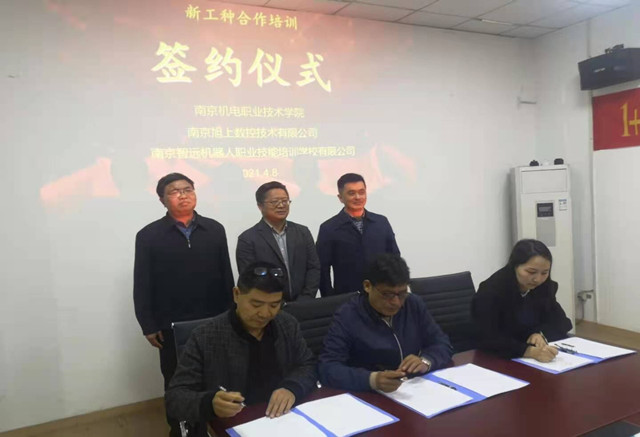 2021年4月8日下午,幻影网页版登录入口_幻影(中国)与南京智远机器人职业技能培训学校有限公司、南京旭上数控有限公司签订新工种开发合作协议。学校党委书记周庆礼,智能制造学院执行院长潘理平、南京智远机器人有限公司所长骆敏舟、南京旭上有限公司总经理吴乐平参加本次活动。