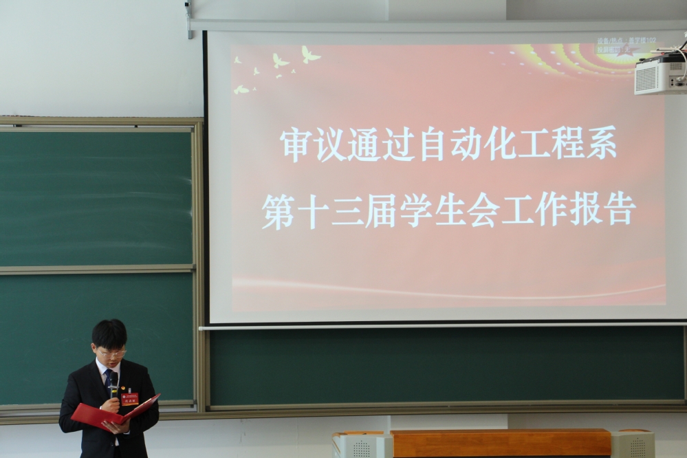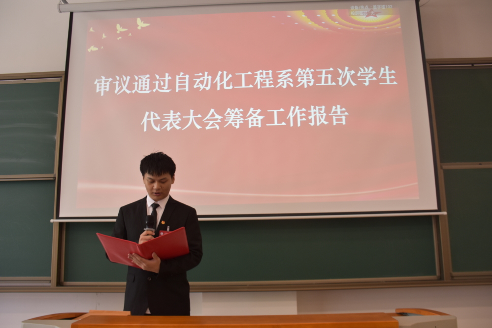 5月14日,幻影网页版登录入口_幻影(中国)自动化工程系第五次学生代表大会在善学楼102胜利召开。幻影网页版登录入口_幻影(中国)自动化工程系党支部副书记杨军、校学生会指导老师钱莉娇、自动化工程系学生会指导老师于靖欢出席大会,全系120名正式代表参加大会,大会由学生会主席蒋翔宇主持。