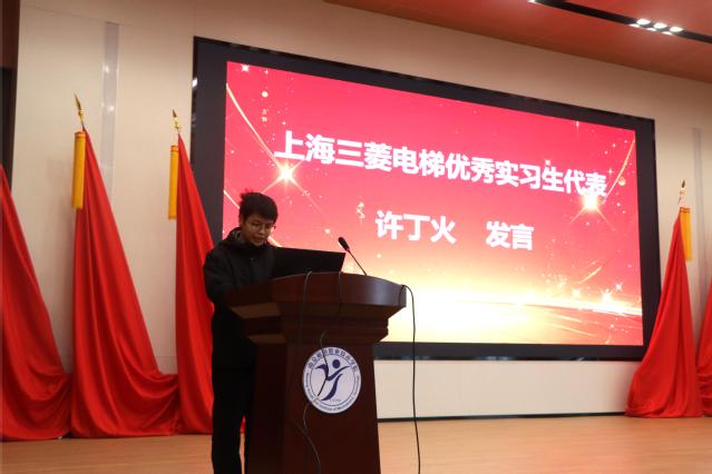 上海三菱电梯有限公司江苏分公司优秀实习生代表许丁火在发言中讲述了自己在实习期间的宝贵经历与深刻感悟,从初入职场的懵懂到逐步掌握专业技能的成长过程,并表达了对学校和企业培养的诚挚感谢。